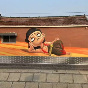 东冯村哪吒墙绘以魔童闹海角色为主,脚踏风火轮等形象生动,传统与现代融合成网红景点。